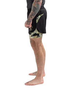 Based on our best-selling Combination Shorts, with subtle improvements, this dual-layer training short is perfect for BJJ, nogi and MMA, or any kind of physical activity or workout. The underlayer is sublimate printed with the custom Scramble x ThruDark tiger camo pattern, which will never peel, crack or fade, and provides a comfortable compression layer beneath the shorts, which are flexible and dip-dyed in black.